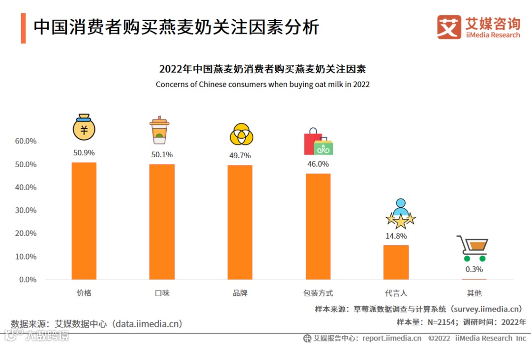艾媒咨询分析师认为,在满足消费者价格、口味等基础需求的前提下,燕麦奶的品牌、包装方式、代言人等方面也成为体现产品差异化的重要因素。