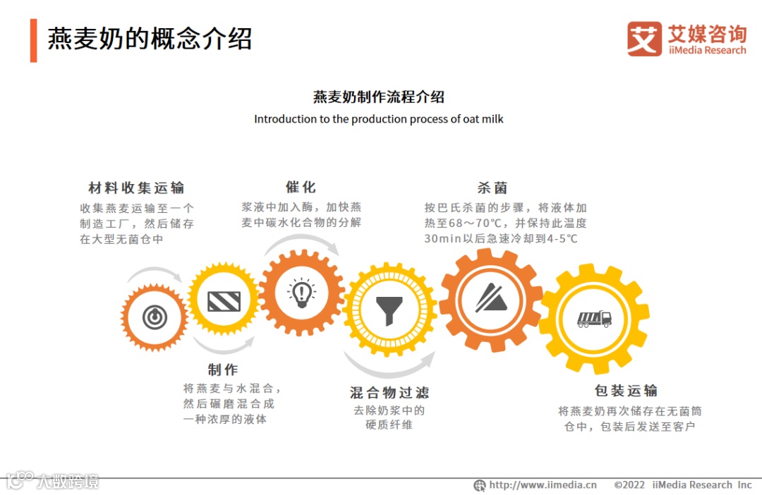 燕麦奶的制作主要分为六个流程,包括收集材料运输、制作、催化、过滤、杀菌和包装运输。