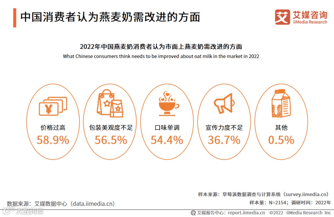 调研数据显示,分别有超过一半的消费者认为市面上的燕麦奶价格过高(58.9%)、包装美观度不足(56.5%)和口味单调(54.4%);除此以外,还有36.7%的消费者认为燕麦奶的宣传力度不足。