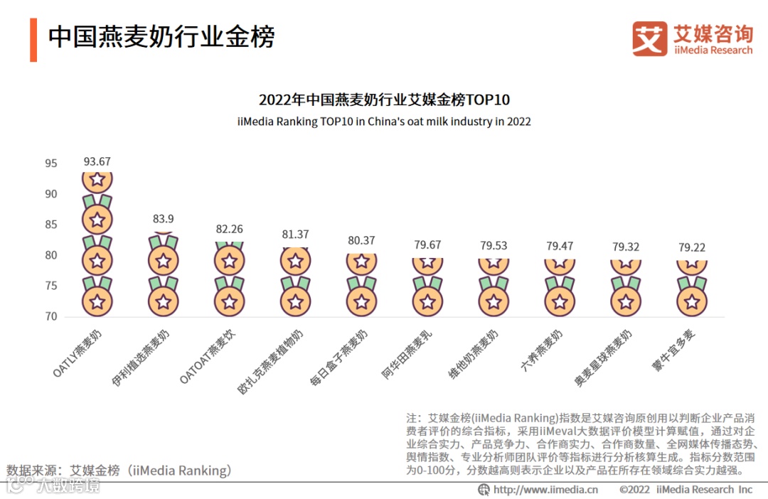 数据显示,OATLY燕麦奶以93.67的高分获得中国燕麦奶艾媒金榜的榜首;其次评分在80分以上的燕麦奶品牌还有伊利植选燕麦奶、OATOAT燕麦饮、欧扎克燕麦植物奶和每日盒子燕麦奶,评分分别为83.9、82.26、81.37和80.37。