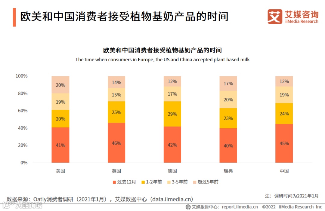 数据显示,在植物基奶几个主要的国家市场中,超过40%的消费者是在过去12个月内开始接受植物基奶产品,超过20%的消费者是在1-2年前开始接受植物基奶产品。