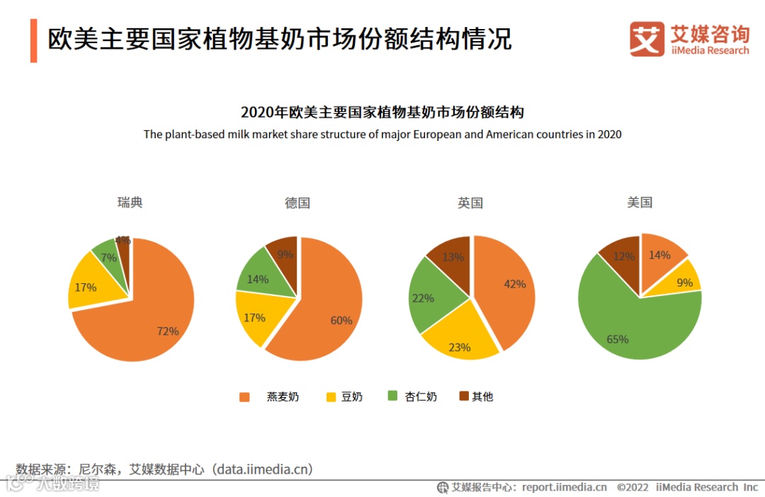 数据显示,截至2020年底,燕麦奶占瑞典、德国、英国和美国植物基奶比重分别达72%、60%、42%和14%,并成为瑞典、德国与英国植物基奶市场最大品类,成为美国植物基奶市场第二大品类。