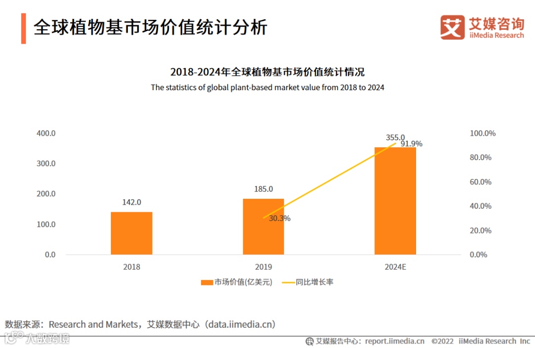 数据显示,2019年全球植物基市场价值达185.0亿美元,较2018年增加了43.0亿美元,同比增长30.3%,预计2024年全球植物基市场价值将达到355.0亿美元。