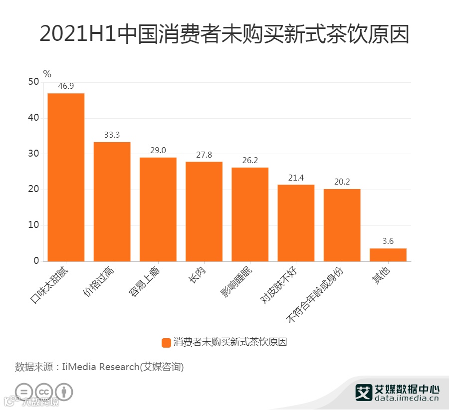 调查数据显示,46.9%消费者未购买新式茶饮的原因是口味太甜腻,33.3%消费者则因为价格太高而未购买新式茶饮。容易上瘾、长肉、影响睡眠也是消费者未购买新式茶饮的原因,占比分别为29.0%、27.8%、26.2%。