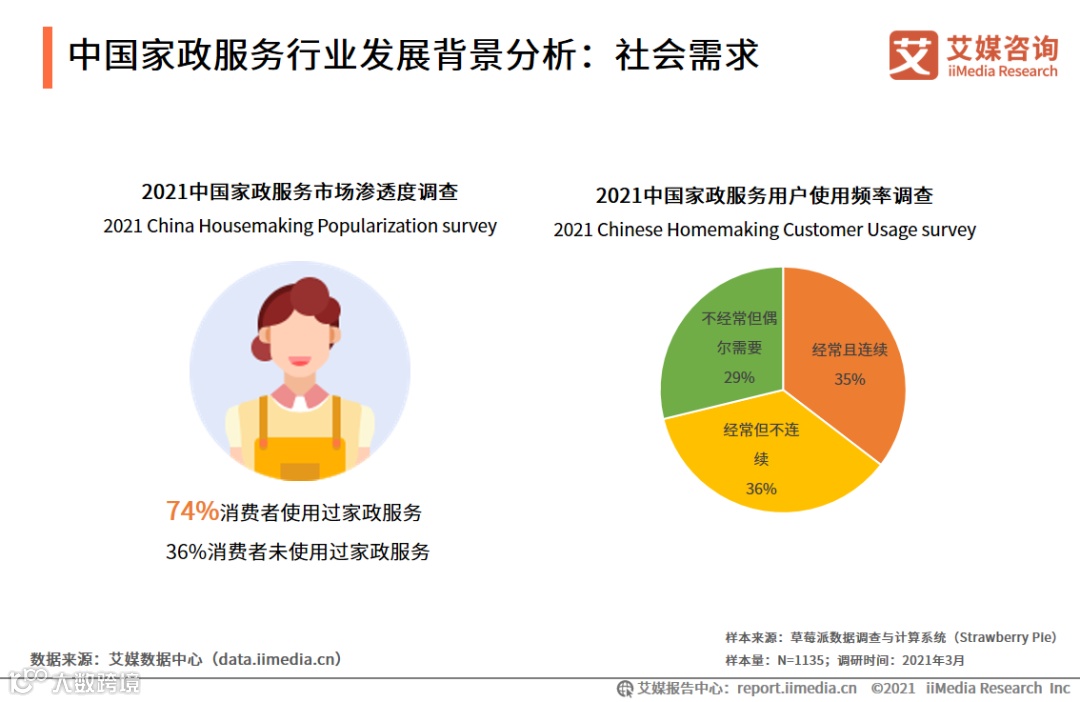 iiMedia Research(艾媒咨询)数据显示,家政服务在中国市场的渗透度较高,使用过家政服务的用户占比过半达74%。艾媒咨询分析师认为,随着疫情后国内经济的迅速回暖,市场对于家政服务行业的需求将逐渐恢复,且行业规模有望进一步扩大。