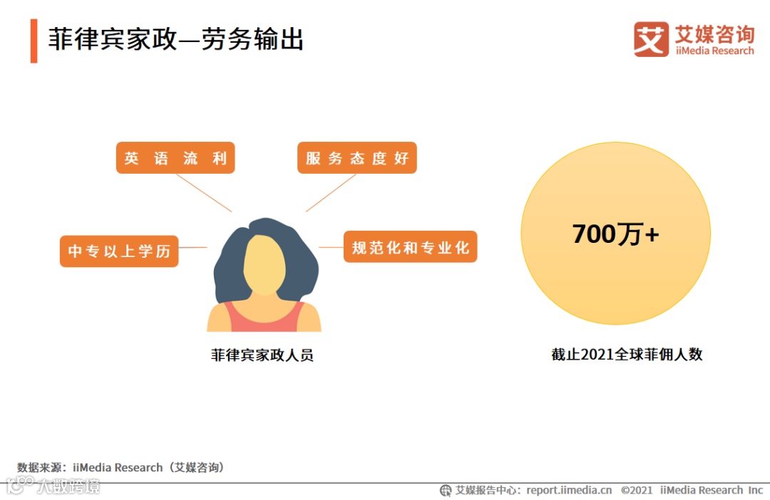 菲律宾的家政教育较为普及,中学和大学几乎均设有家政课。菲佣大部分具有中专以上学历,其中不乏教育、心理学、财会专业毕业的大学生,部分菲佣还持有护士、医师或教师的执照,英语流利。菲律宾的家政服务行业以劳务输入为特点,向世界各地输出菲佣服务。作为家政服务的品牌,菲佣在全球范围内享有盛名。目前全世界有193个国家和地区的家庭雇用了菲佣,菲佣人数超700万,约占菲律宾全国人口的10%。