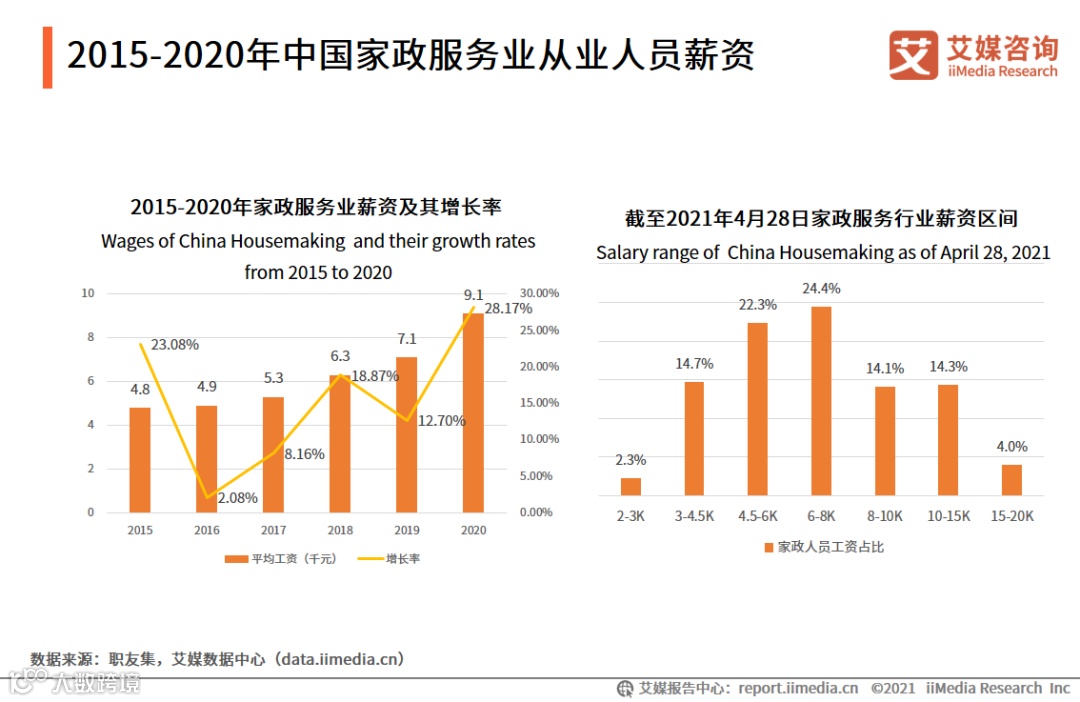 数据显示,2015年至2020年中国家政服务业从业人员平均薪资不断增长,2020年家政服务业平均薪资为约九千元,较20019年增长约28%;截至2021年4月28日,中国家政服务业从业人员的薪资区间在两千至两万之间,其中,薪资在六千至八千的从业人员数量最多,占比24.4%。艾媒咨询分析师认为,与各类行业薪资平均值相比,家政服务业的薪资在未来还有增长空间。