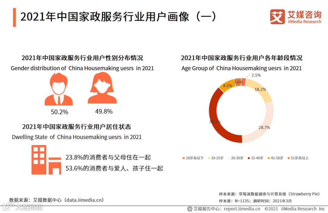 数据显示,2021年中国家政服务行业用户中,男性消费者稍微偏多,但总体性别分布均匀。从年龄段来看的话,以中青年消费者为主,31-40岁、26-30岁的用户分别占比38.4%和28.7%。同时,用户大多和父母或小孩住在一起,对家政服务需求较大。