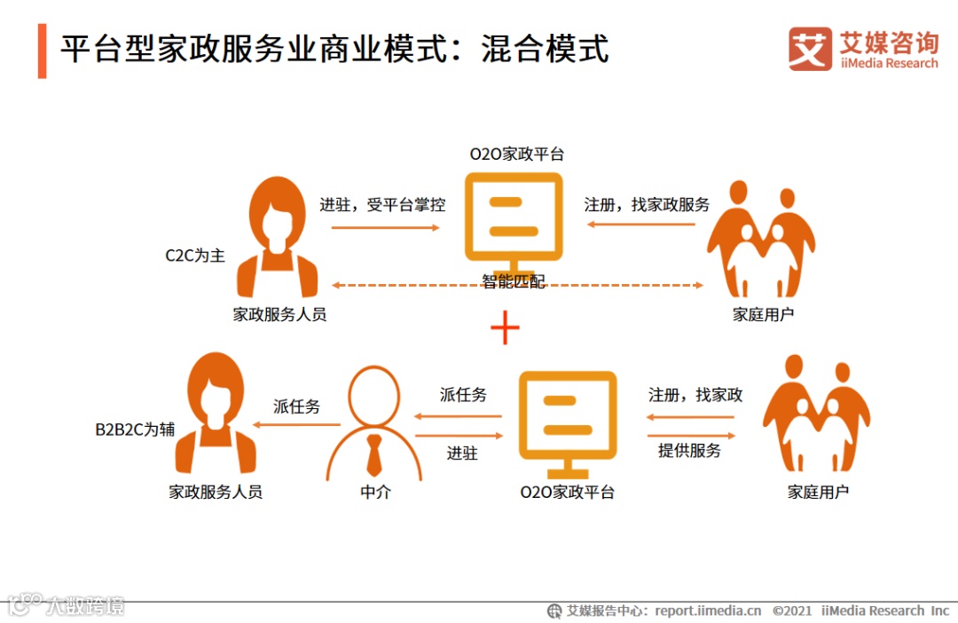 此模式综合了C2C平台模式和B2C平台模式,一方面,平台掌控家政服务人员,用户通过平台下单,平台智能匹配用户和家政服务人员;另一方面,平台还吸收中介进驻,将一些接到的业务派给中介,中介则协调家政服务人员上门服务。