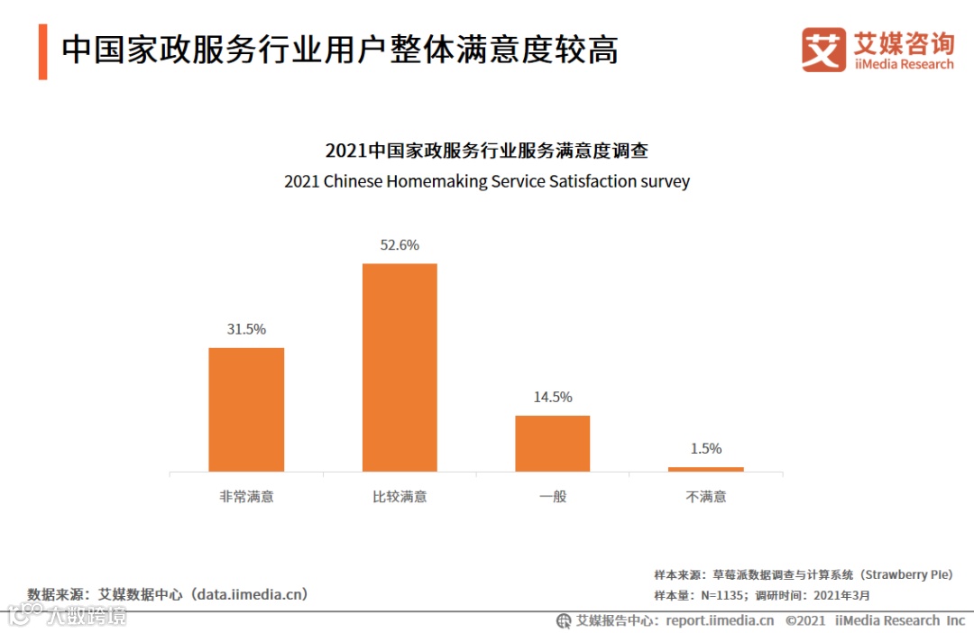 iiMedia Research(艾媒咨询)数据显示,超过3成雇主表示非常满意,超过5成表示比较满意,仅有1.5%的雇主明确表示不满意,整体而言,中国家政服务行业雇主对家政服务的整体满意度较高。