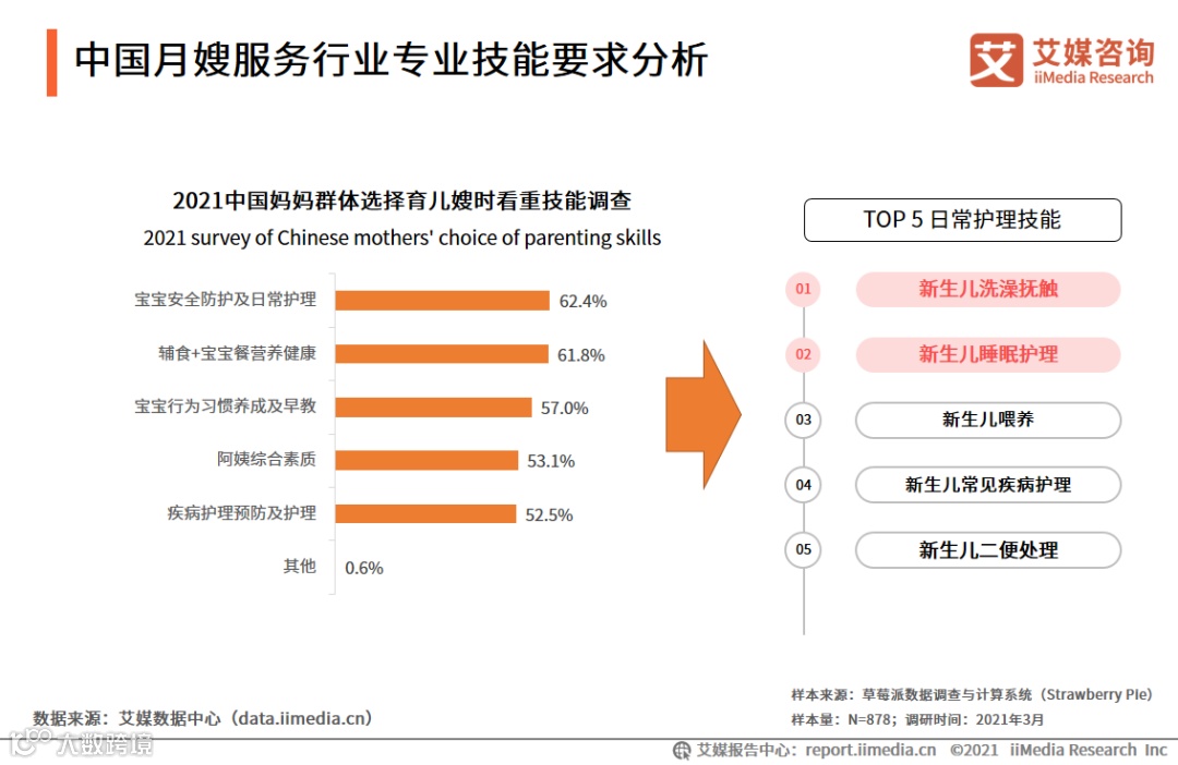 月嫂提供专业护理服务,减轻育儿压力。数据显示,妈妈群体在选择育儿嫂时,比较看重的是宝宝安全防护及日常护理、宝宝饮食营养健康、宝宝行为习惯养成及早教、疾病防护等技能,因而综合素质较高的育儿嫂更受妈妈群体的欢迎。
