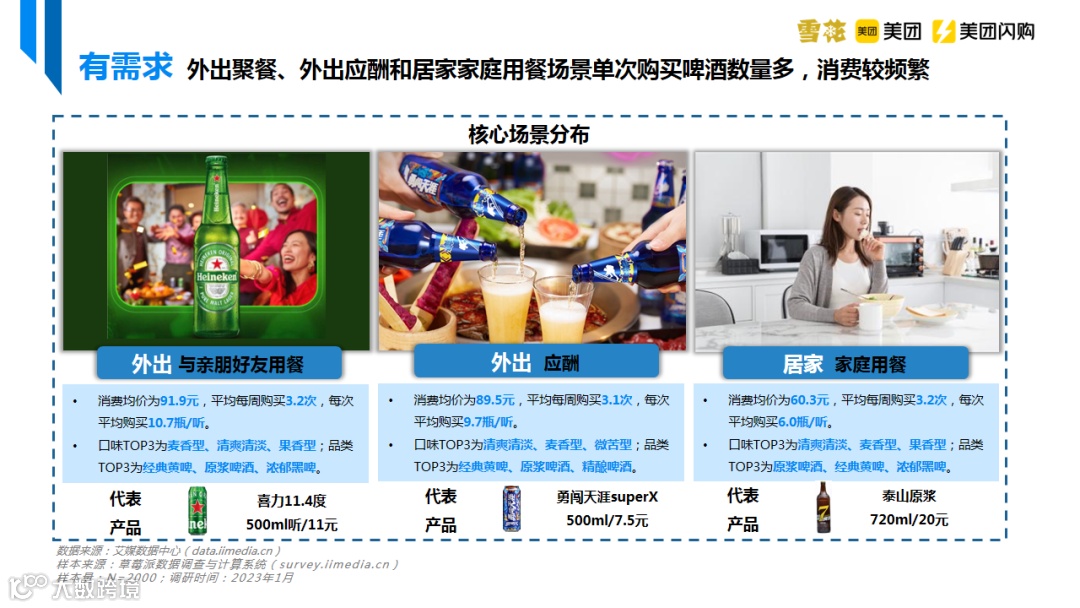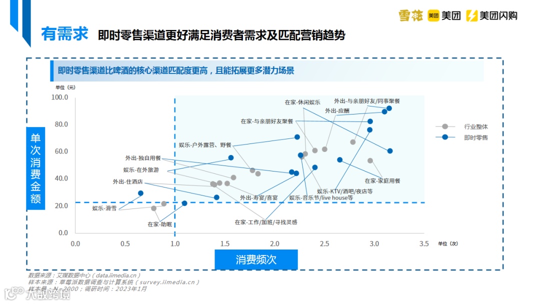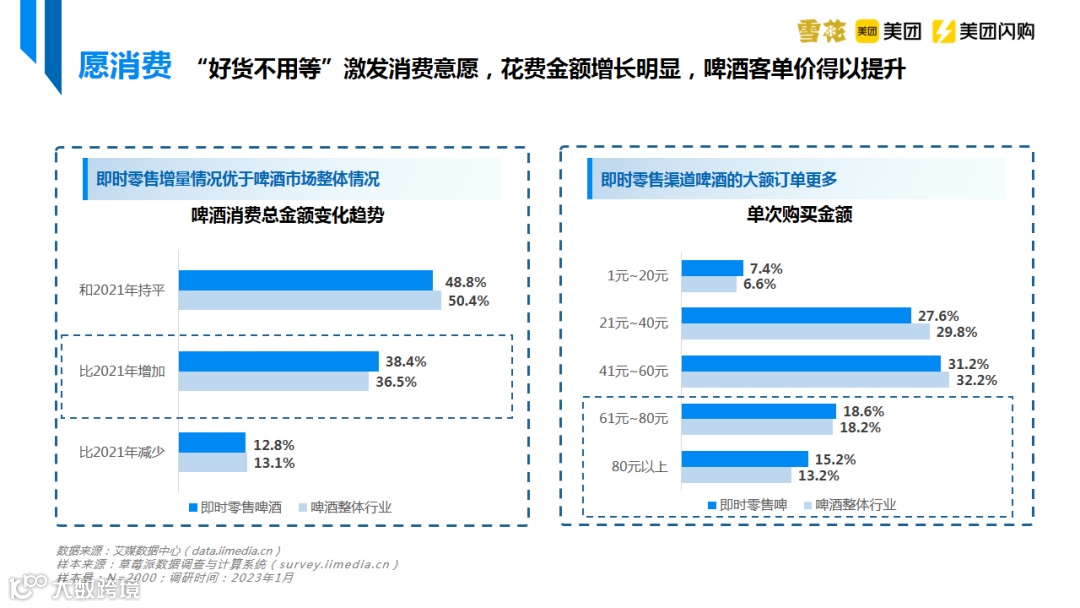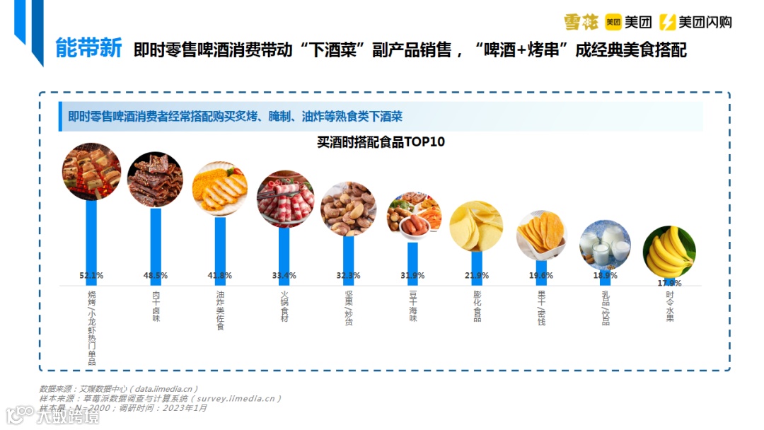 即时零售消费者年轻男性居多,他们有长年的饮酒习惯且消费基础较好,主要因为方便快捷、习惯延展选择即时零售渠道购买啤酒。消费者对即时零售啤酒的需求逐渐显现,消费者粘性较高。啤酒饮用场景逐渐多元化,有38.4%的消费者在即时零售渠道购酒金额超过2021年,并拉动了即时零售渠道“下酒菜”的销量。