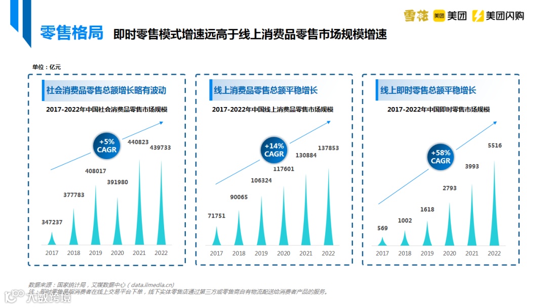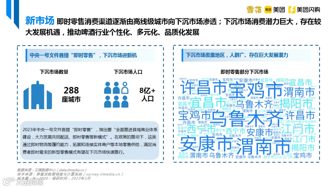 新市场:2023年中央一号文件首提“即时零售”,指出要“全面推进县域商业体系建设,大力发展共同配送、即时零售等新模式”。在政策的推动下,这类通过即时物流等履约能力,拓展和连接实体商户等本地零售供给,满足消费者即时需求的新型零售模式有望在下沉市场快速推行。