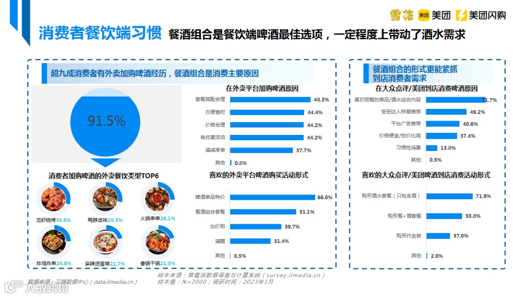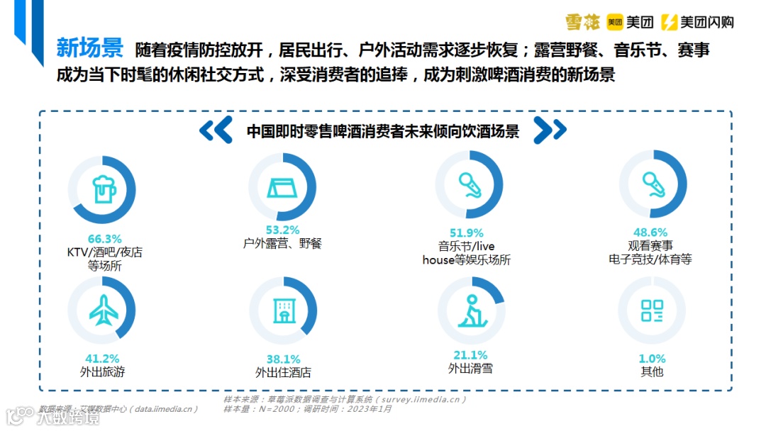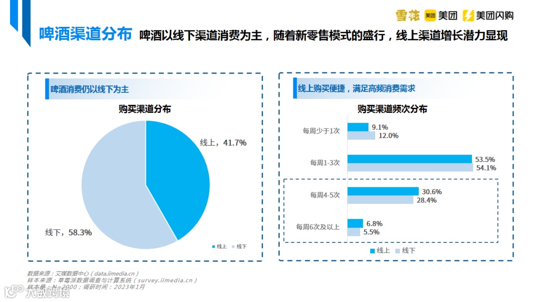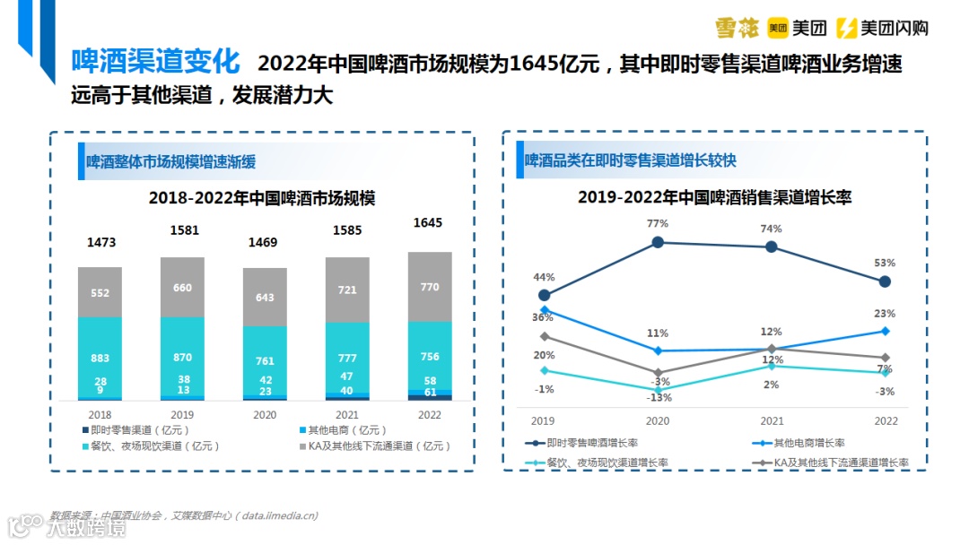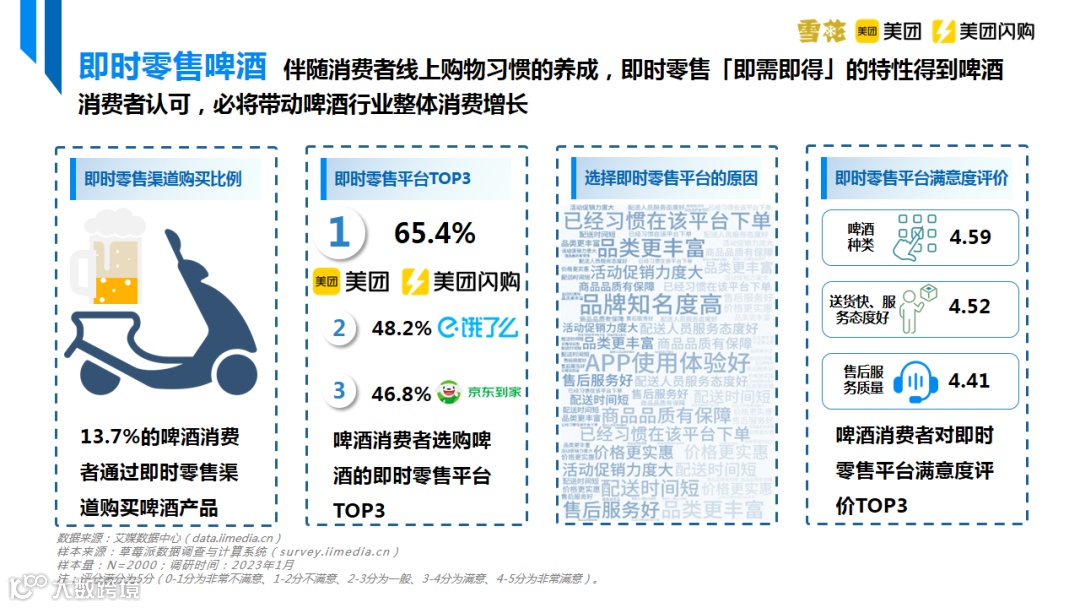 国家统计局数据显示,2017年-2022年,中国线上消费品零售市场增长整体较好,随着新零售模式的盛行,即时零售渠道增长潜力显现。在啤酒赛道,即时零售渠道增速已远超其他渠道,有望拉动啤酒市场的整体增长。啤酒以线下渠道消费为主,但随着即时零售模式的出现,满足了消费者即需即得的饮酒需求。数据显示,13.7%的啤酒消费者通过即时零售渠道购买啤酒产品,65.4%的消费者通过美团闪购下单啤酒。