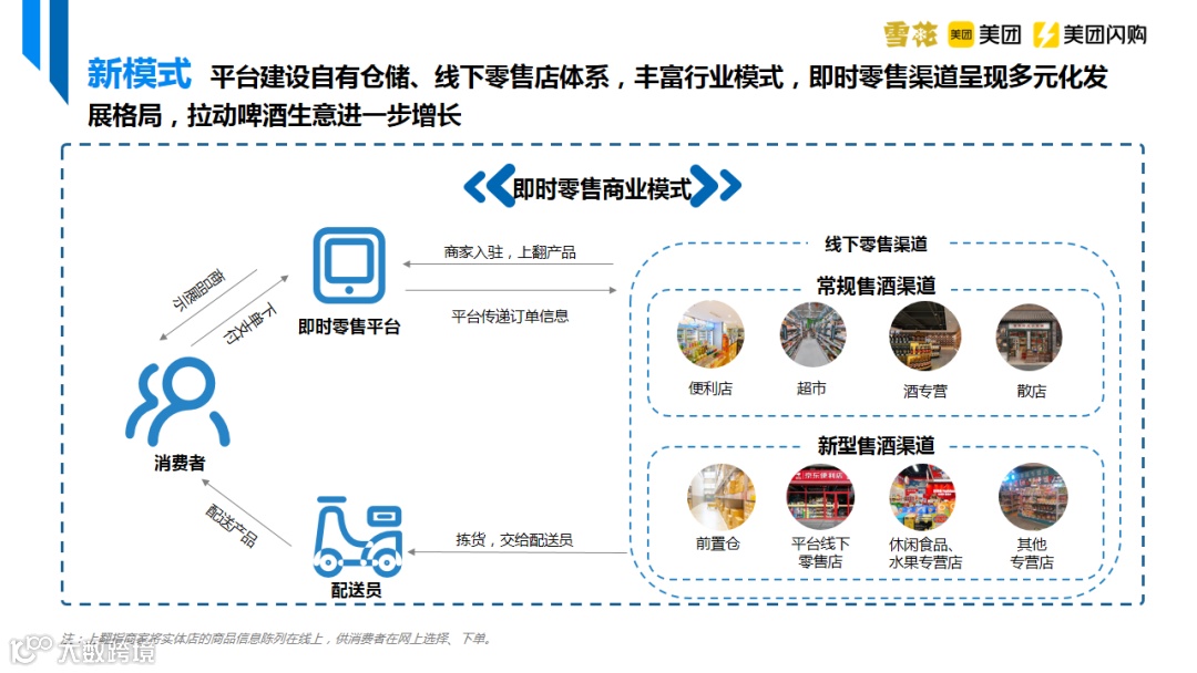 新模式:随着即时零售啤酒的快速增长,其商业模式也在不断丰富,即时零售渠道呈现多元化发展格局,更多类型的线下渠道融入即时零售模式当中,如平台自有前置仓、平台自有零售店等。