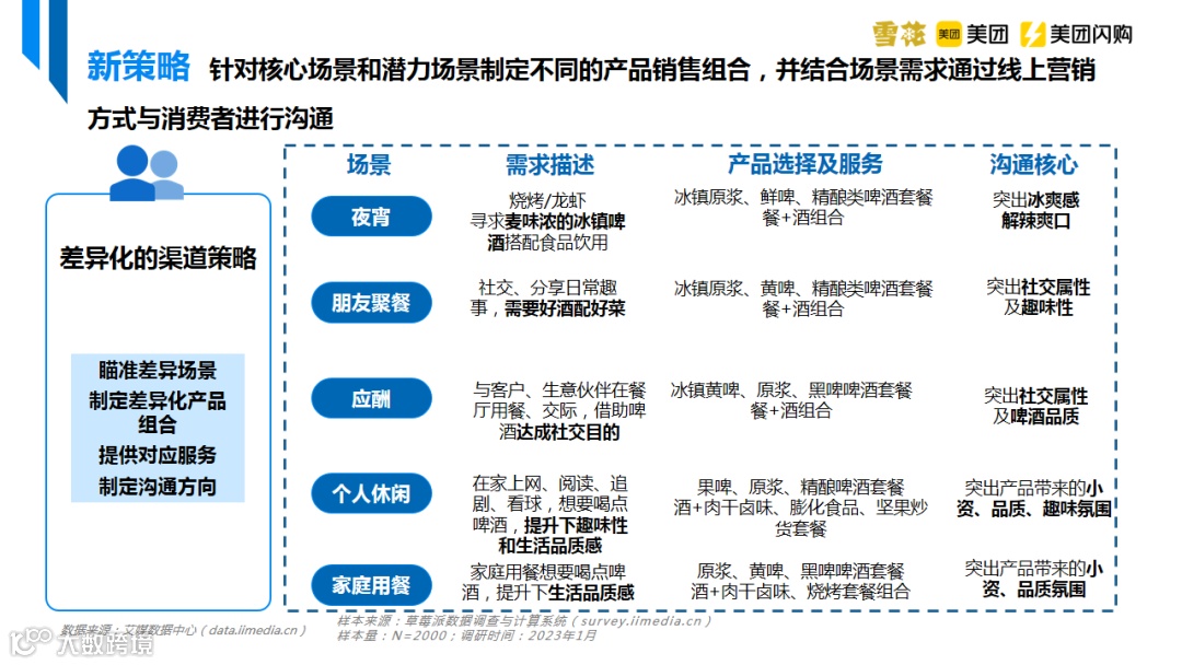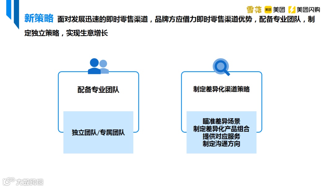 新策略:面对发展迅速的即时零售渠道,品牌方应借力即时零售渠道优势,在销售部下设独立的即时零售团队,并为其配备财务、策略、IT等资源支持和独立预算。在不同核心场景和潜力场景制定不同的产品销售组合,同时结合场景需求通过线上营销方式与消费者进行沟通,实现生意增长。