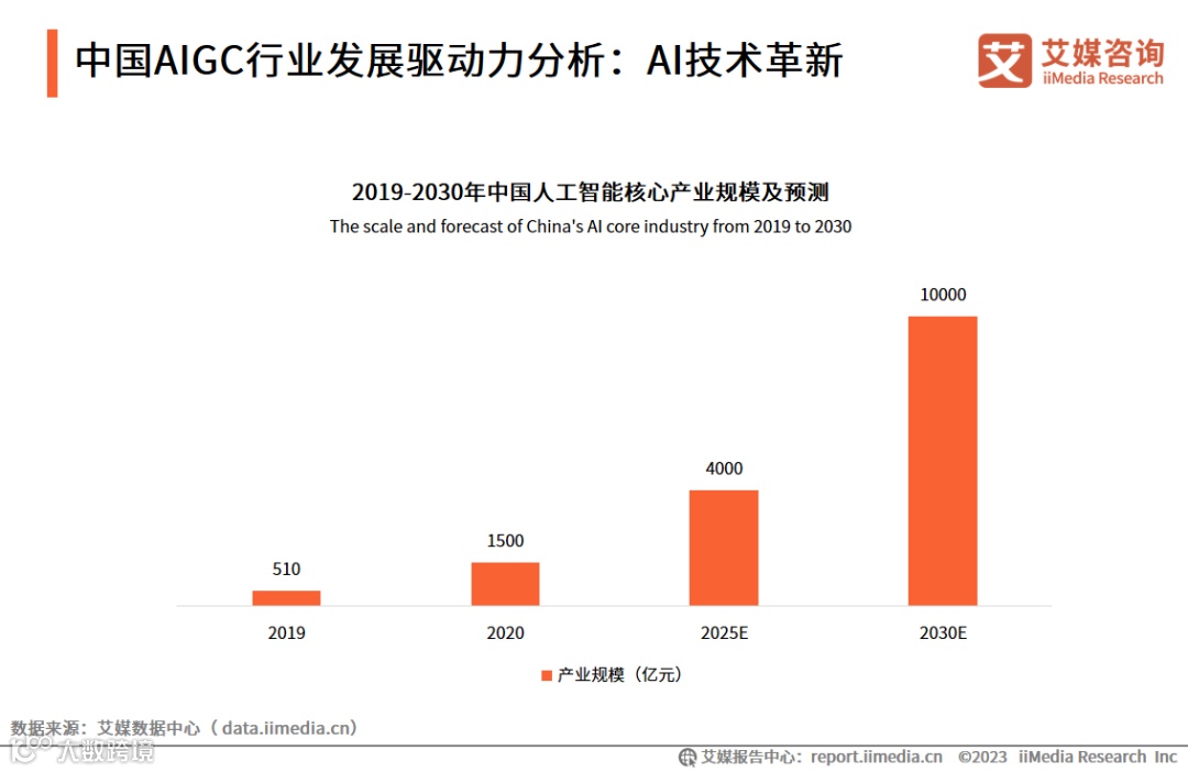 随着国家政策的倾斜和5G等相关基础技术的发展,中国人工智能产业在各方的共同推动下进入爆发式增长阶段,市场发展潜力巨大。数据显示,2020年中国人工智能核心产业规模就已达1500亿元,预计在2025年将达到4000亿元,未来有望发展为全球最大的人工智能市场。而AIGC的存在,将会极大释放人类的想象力,掀起属于这个时代的“新艺术浪潮”。