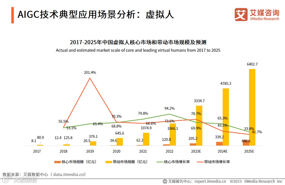 iiMedia Research(艾媒咨询)数据显示,虚拟人产业保持稳定增长态势。中国虚拟人带动产业市场规模和核心市场规模预计2025年分别达到6402.7亿元和480.6亿元。目前“深度合成+计算驱动”型的虚拟人,综合运用文本、图像、音频等生成技术,打造综合外观、面部表情、发声习惯等产出全面拟人化的数字内容,属于AIGC领域。此种多模态生成技术的聚合应用在虚拟偶像、虚拟主播等领域。