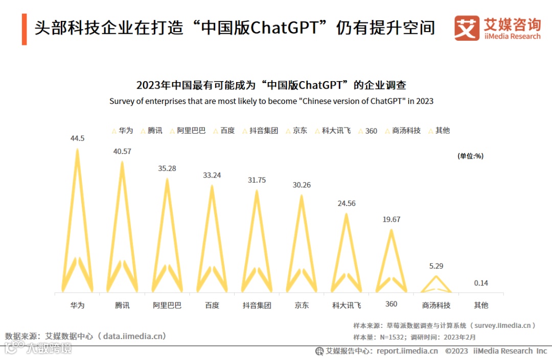调研数据显示,华为、腾讯、阿里巴巴、百度、抖音是最有希望打造出“中国版ChatGPT”的企业。艾媒咨询分析师认为,ChatGPT火爆基于强大的AI能力和大数据能力,中国的头部科技企业在技术储备以及产品能力方面,都还有一定的提升空间。目前ChatGPT在产业化和商业化应用上仍有较大的发展空间。