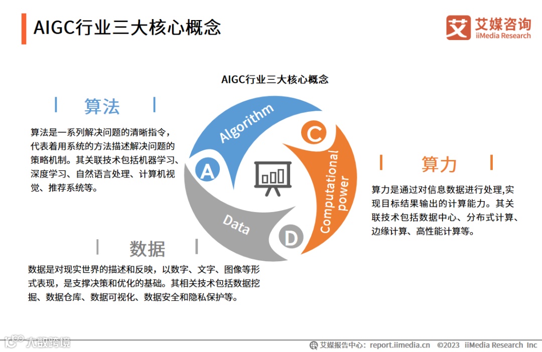 AIGC是人工智能与大数据、云计算、5G等多个技术领域的整合,是一种跨领域的合作发展模式。在人工智能产业中,算力、算法、数据是三个核心概念,它们构成了AI领域的基础设施,是支撑AIGC行业创新和发展的必要前提。