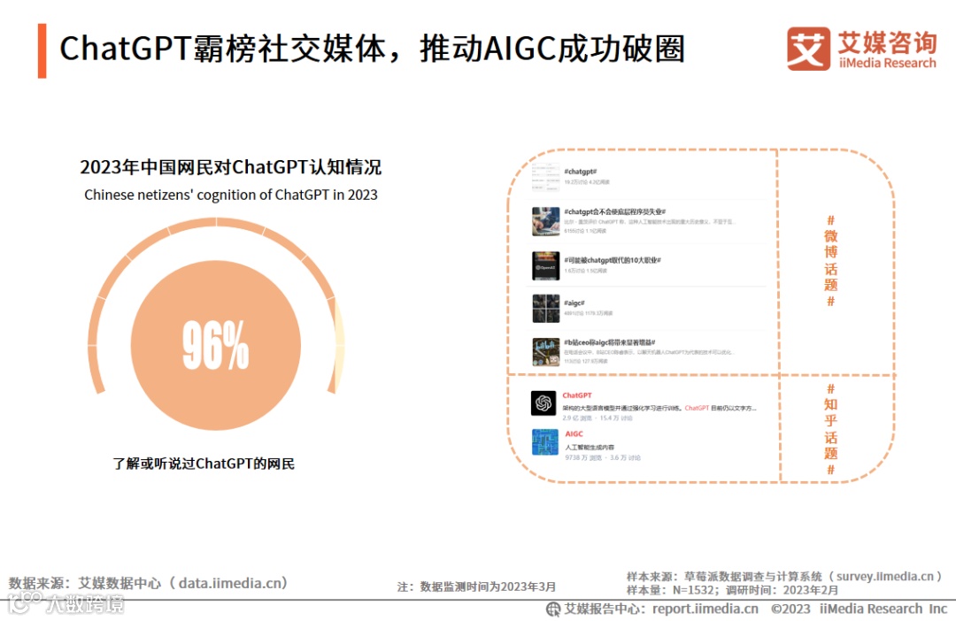 ChatGPT是人工智能产业链发展到一定阶段的必然产物,其背后揭示的其实是人工智能技术生成内容(AIGC)所带来深刻的生产力变革。调研数据显示,96%的网民了解或听说过ChatGPT。截至2023年3月,微博平台上ChatGPT话题已有19.2万讨论、4.2亿次阅读,其他相关热门话题均有上亿阅读量。艾媒咨询分析师认为,ChatGPT的火热提升了用户对AIGC的认知,对于未来AIGC应用普及与推广具有重要意义。