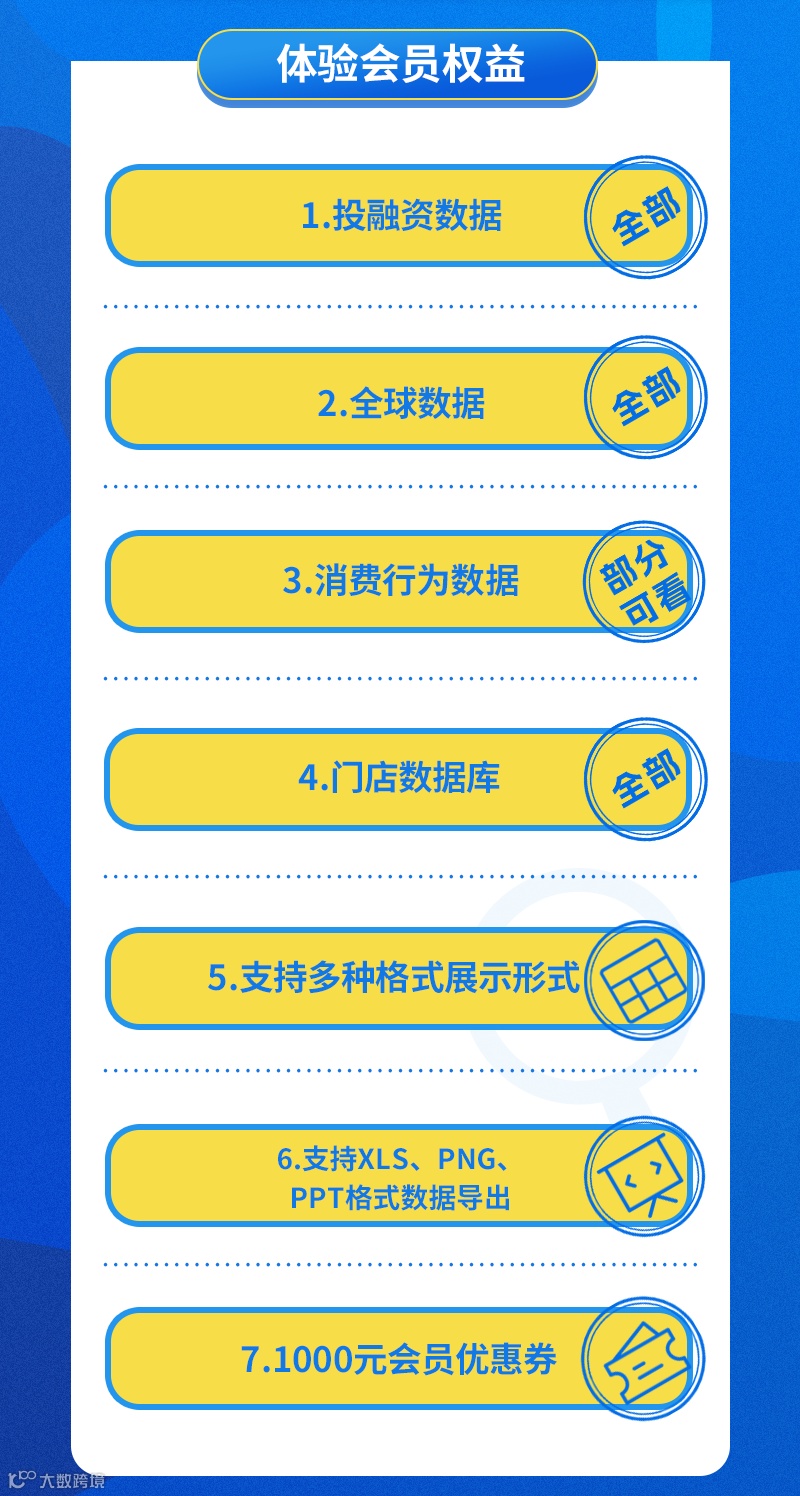 【消费行为数据】【全球数据】【投融资数据】【门店数据】4大板块数据,数据支持图表下载,权益多多,快快注册一览为快!还有1000元、3000元、6000元会员优惠券等你拿!