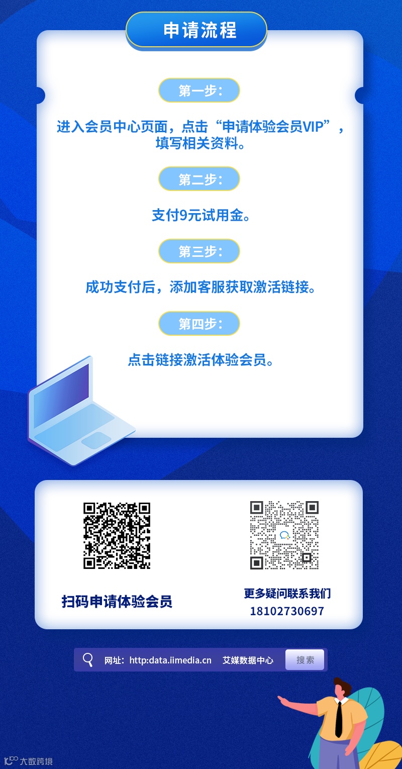 现扫描下方图片二维码点击文末“阅读原文”进入会员中心页面,也可登录艾媒数据中心官网(data.iimedia.cn),点击“申请体验会员VIP”,填写相关资料。仅需9元即可领取15天艾媒数据中心体验会员权益!