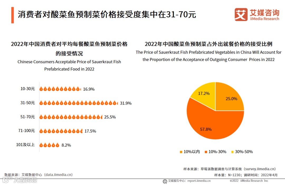 数据显示,消费者能够接受平均每餐酸菜鱼预制菜的价格集中在31-70元,比例达57.4%。有57.8%的消费者能够接受酸菜鱼预制菜的价格占外出就餐的10%-30%。