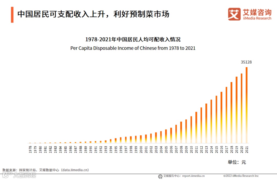 数据显示,1978-2021年中国居民人均可支配收入持续增长,2021年增至35128元。中国城乡居民恩格尔系数分别从1978年的57.5%、67.7%下降到2021年的28.6%、32.7%。艾媒咨询分析师认为,中国居民消费水平的显著提升,居民消费已从温饱型向享受型、发展型转变,推动餐饮美食品类多元化发展,为预制菜市场奠定经济基础。