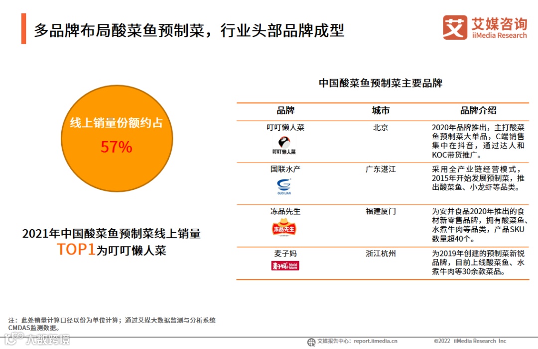 随着酸菜鱼预制菜市场火热,多品牌入局,行业竞争格局逐渐形成。线上渠道是酸菜鱼预制菜品牌C端布局的主要渠道,从2021年酸菜鱼预制菜品牌线上销量份额来看,叮叮懒人菜线上销量占比最高,约占酸菜鱼预制菜线上总销量的57%,已成为酸菜鱼预制菜行业头部品牌。
