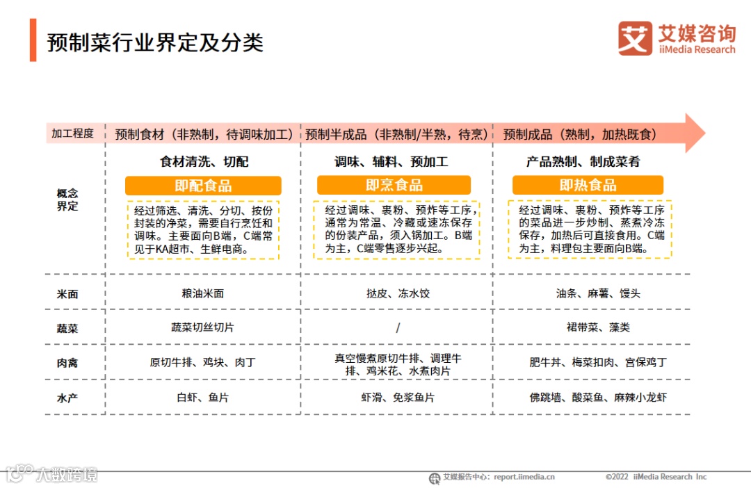 预制菜是指以一种或多种食材为主要原料,配以或不配以辅料和调味品(含食品添加剂),经洗、切、搭配等加工或炒、炸、烤、煮、蒸等技法烹调后制成的即食、即热、即烹、即配菜肴或主食,所以预制菜也叫预烹饪食品。预制菜按照加工程度以及原辅料来划分,可以分成即配食品、即烹食品以及即热食品。