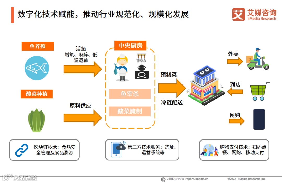 酸菜鱼预制菜是在中央厨房预先制作出来的“半成品”,通过冷链运输进行售卖,消费者通过外卖、网购、到店等方式购买。除了冷链运输技术外,大数据等新技术赋能餐饮全产业链,从配送、选址、营销等方面助推酸菜鱼预制菜企业进行数字化运营,有利于酸菜鱼预制菜市场规范化、规模化发展。