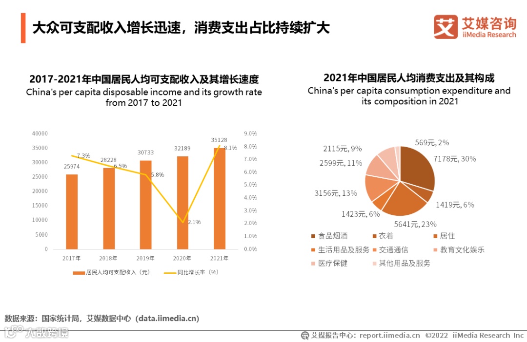 2021年中国居民人均可支配收入为35128元,比上年实际增长8.1%;居民人均消费支出24100元,比上年实际增长12.6%。其中,人均服务性消费支出10645元,比上年增长17.8%,占居民人均消费支出的比重为44.2%。2022年第一季度,全国居民人均可支配收入10345元,同比增长5.1%。艾媒咨询分析师认为,大众消费水平不断提高,服务性消费支出增长迅速,国民将追求更高的产品服务品质。