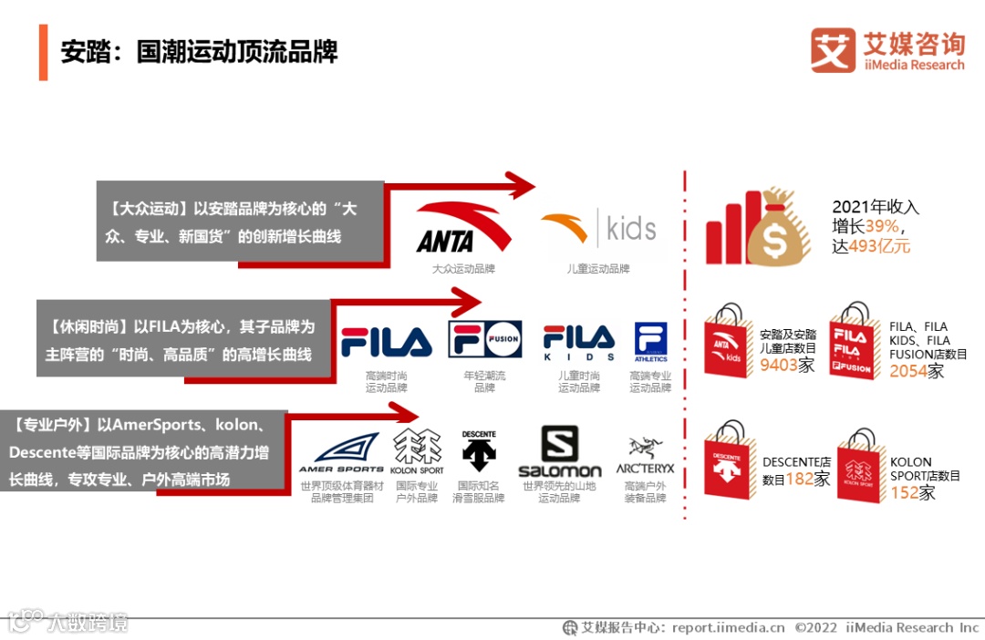 安踏(中国)有限公司创建于1991年,是一家专门从事设计、生产、销售运动鞋服、配饰等运动装备的综合性、多品牌的体育用品集团。2009年,安踏收购FILA,标志着品牌从专业运动转向时尚运动领域。安踏经过三十年的发展,旗下有FILA、ANTA、始祖鸟以及Wilson等共25个品牌,通过不同领域的品牌布局,品牌矩阵三条增长曲线全面渗透多层级市场,满足不同人群兴趣需求。
