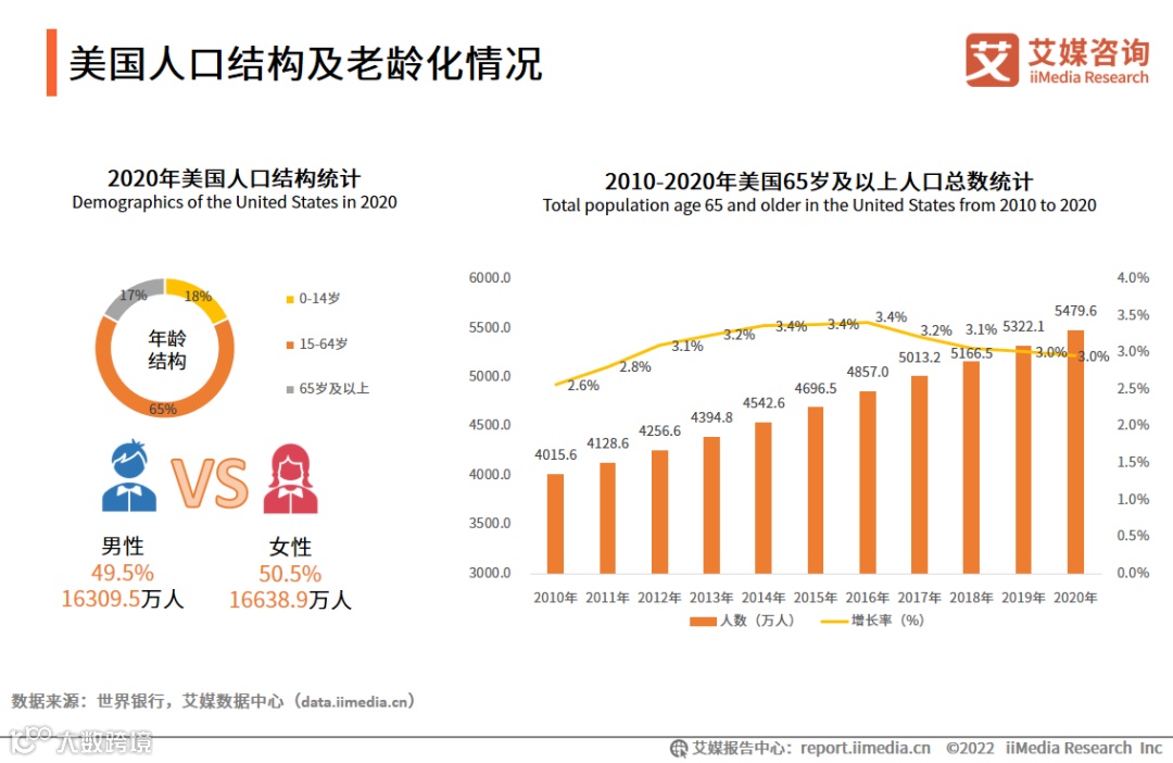 受人口老龄化影响,全球抗衰老市场规模得到进一步扩大。iiMedia Research(艾媒咨询)数据显示,从年龄构成来看,2020年美国15-64岁人口比重为65%;65岁及以上人口数量为5479.6万人,占总人口比重为17%,比2010年增长1464.0万人,可见美国已步入老龄化社会,且根据美国最新人口普查预测,2030年超过65岁的人口数量将增长至7400万人。
