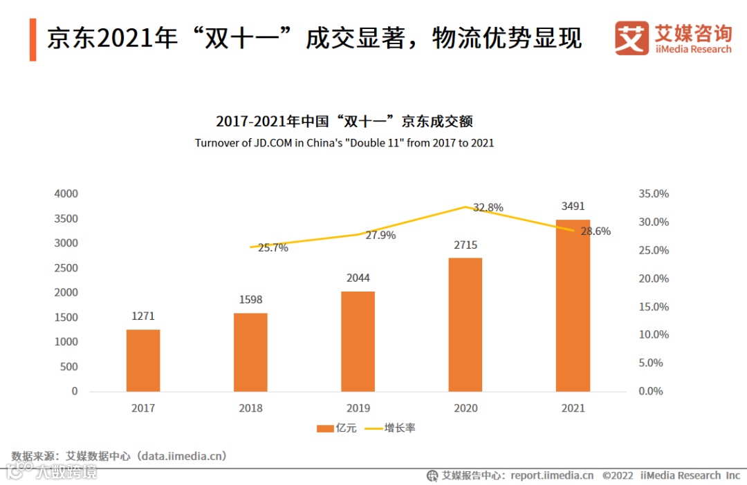数据显示,京东“双十一”的成交额从2017年的1271亿元增至2021年的3491亿元。艾媒咨询分析师认为,因京东具有物流服务和售后服务优势,用户黏性较强,这有望为京东发展持续赋能。