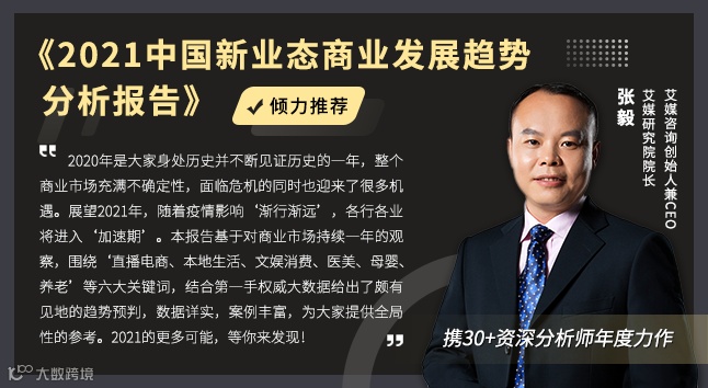 为此,基于对商业市场的持续观察,艾媒咨询将重磅发布年度力作——《2021中国新业态商业发展趋势分析报告》,该报告由艾媒咨询创始人兼CEO、艾媒研究院院长张毅牵头,30+资深分析师共同参与完成,数据详实,案例丰富,观点独到,为中国商业及新兴领域的未来发展把脉献策。