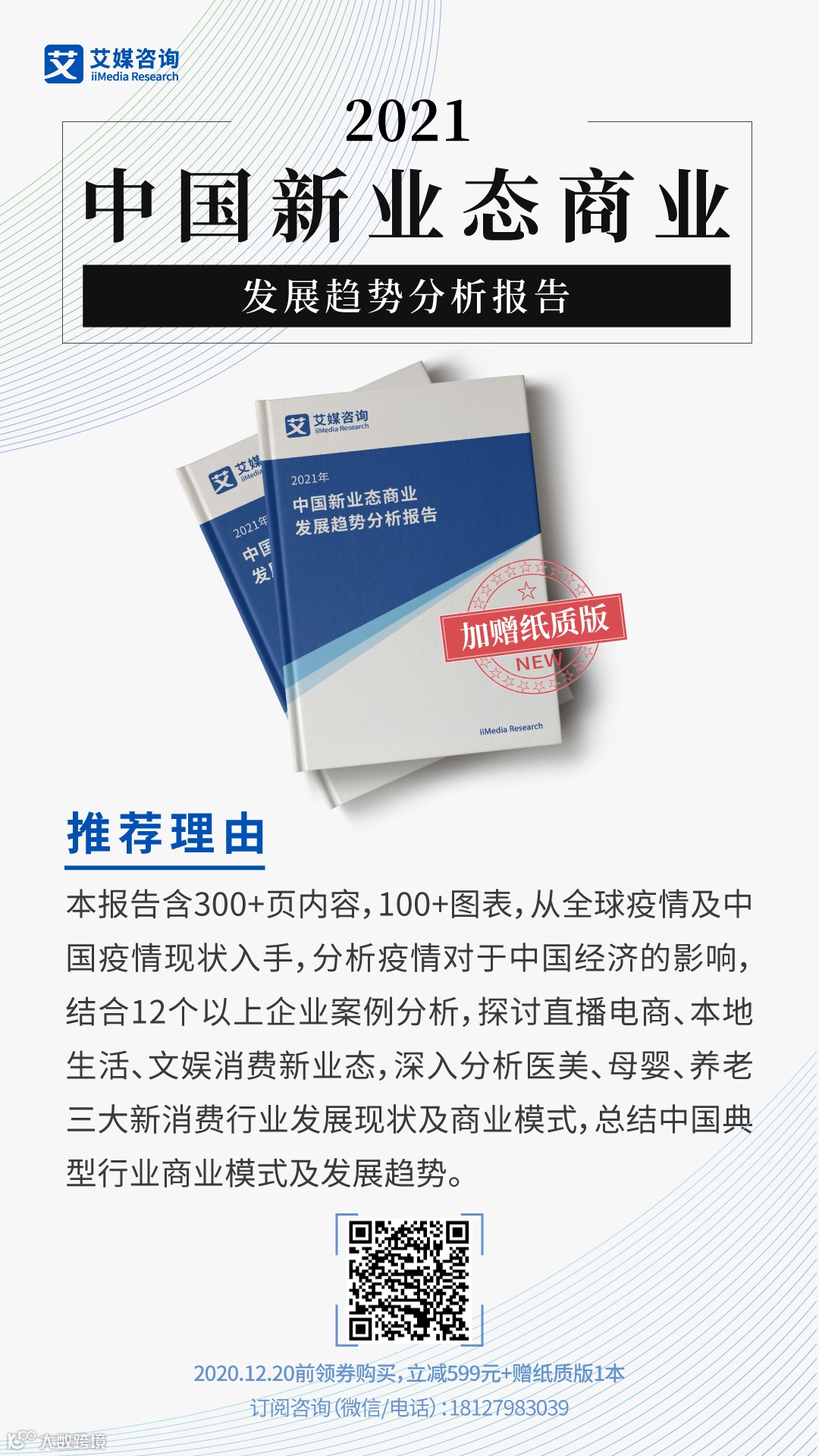 《2021中国新业态商业发展趋势分析报告》根据艾媒数据中心、艾媒咨询商业情报数据库、艾媒商情舆情数据监测系统基础数据,对全球及中国疫情发展现状、疫情影响下各行业发展现状等进行了全面分析,具体针对直播电商、本地生活、文娱消费等新业态,以及医美/轻医美、母婴、养老等消费行业进行了深度解读,并结合12个以上典型企业进行案例分析,对行业经济发展新趋势进行预判。