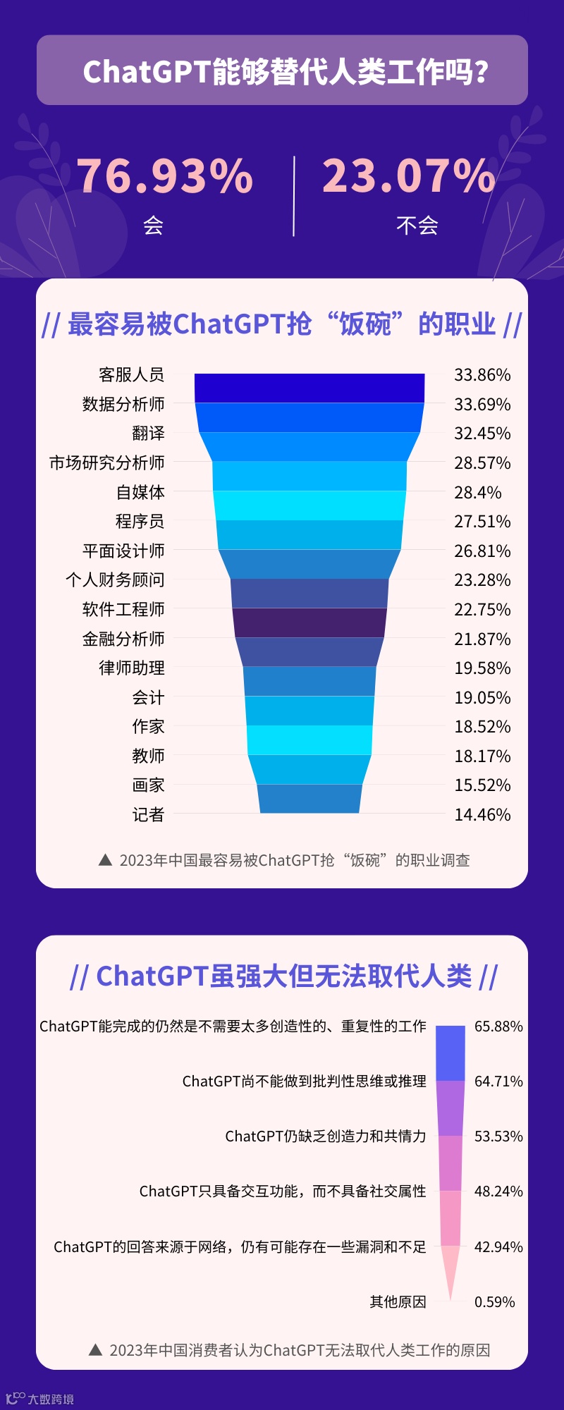 ChatGPT强大的功能令人震撼的同时,也让许多人感受到了职业危机。艾媒咨询调研数据显示,76.93%的受访用户认为ChatGPT能够替代人类工作,23.07%的受访用户认为不能。可见,随着AI技术的不断提高,人们也开始担心它将对人类的就业市场产生消极影响,悲观预期ChatGPT能够取代人类工作。