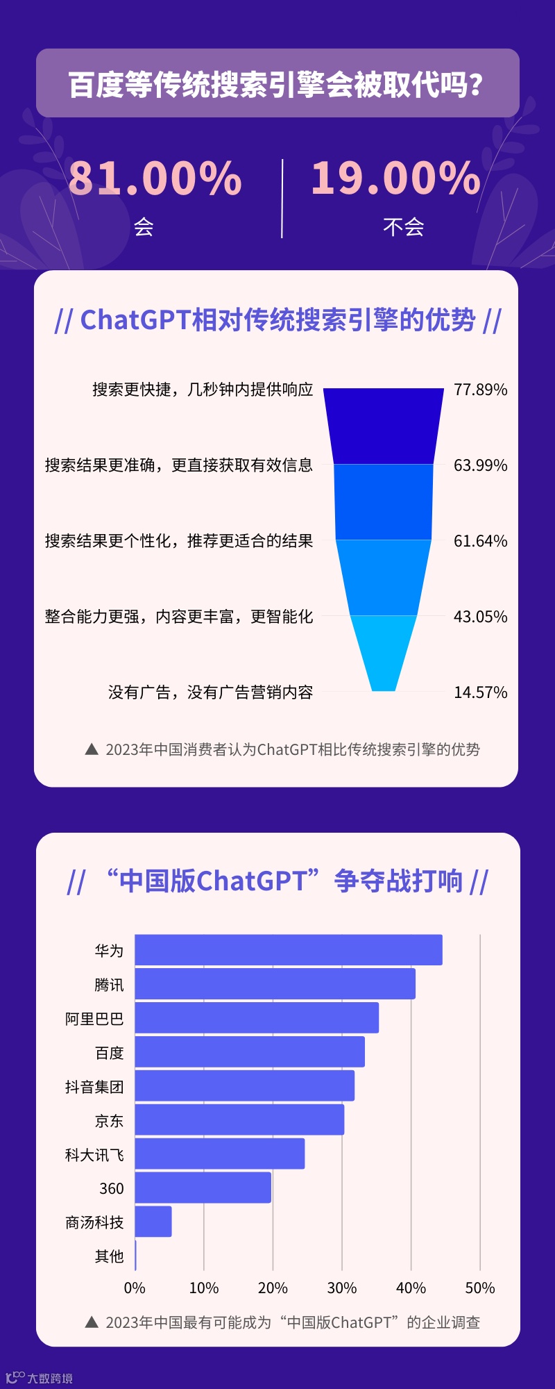 艾媒咨询调研数据也显示,81%的受访用户认为百度等传统搜索引擎会被ChatGPT取代,但也有19%受访用户认为传统搜索引擎不会被取代。