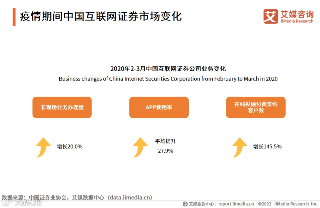 数据显示,与2019年12月相比,2020年2-3月疫情期间,中国证券公司非现场业务办理量增长了20.0%,APP使用率平均提升27.9%,在线投顾付费签约客户数增长145.5%。