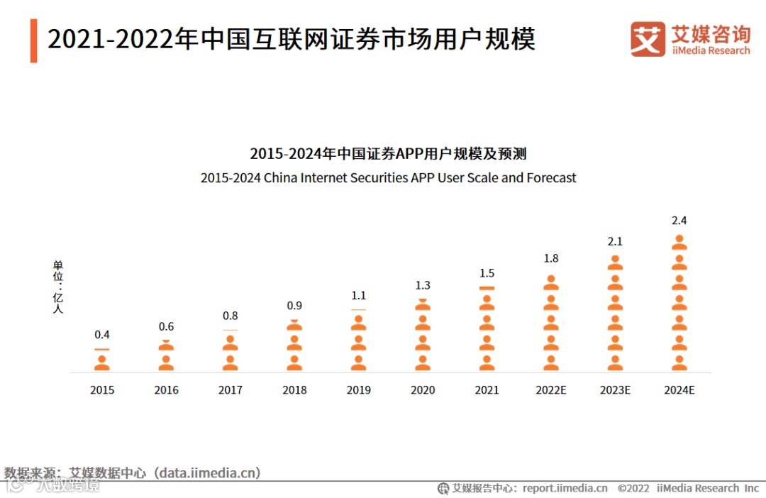 iiMedia Research(艾媒咨询)数据显示,中国证券APP用户规模增长迅速,从2015年的4000万人增长至2021年的1.5亿人,在六年时间里增加2.8倍,平均增速46.7%。