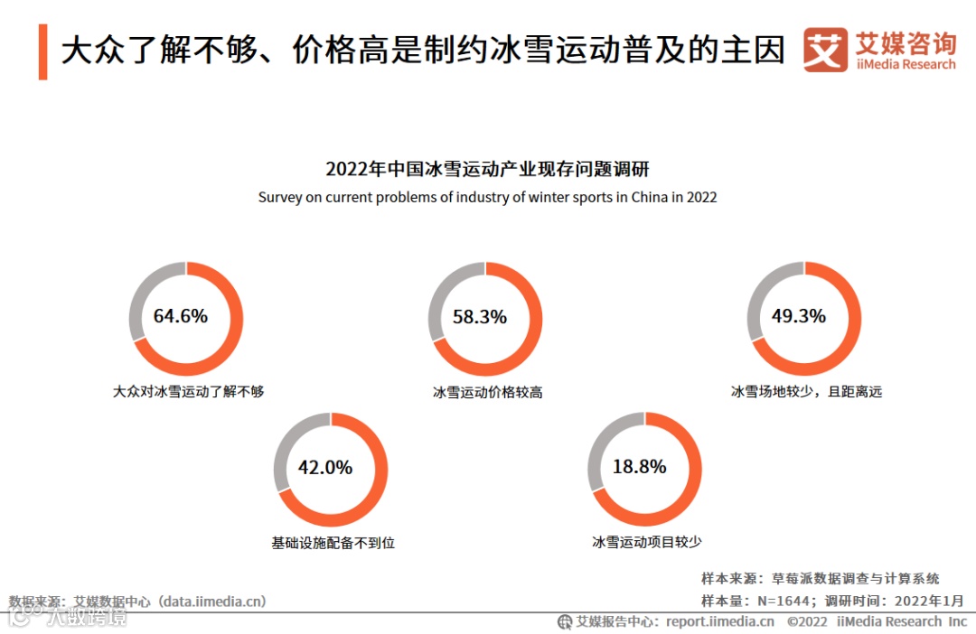 iiMedia Research(艾媒咨询)调研数据显示,受访者认为制约冰雪运动进一步普及的原因是对冰雪运动了解不够(64.6%)、冰雪运动价格高(58.3%)。
