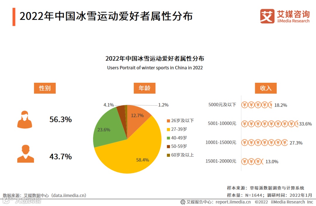 iiMedia Research(艾媒咨询)调研数据显示,2022年中国冰雪运动群体主要以青年人为主,其中27-39岁的冰雪运动爱好者占比为58.4%。冰雪运动爱好者主要为中等收入群体,有超过三成的冰雪运动爱好者收入在5000-10000元。