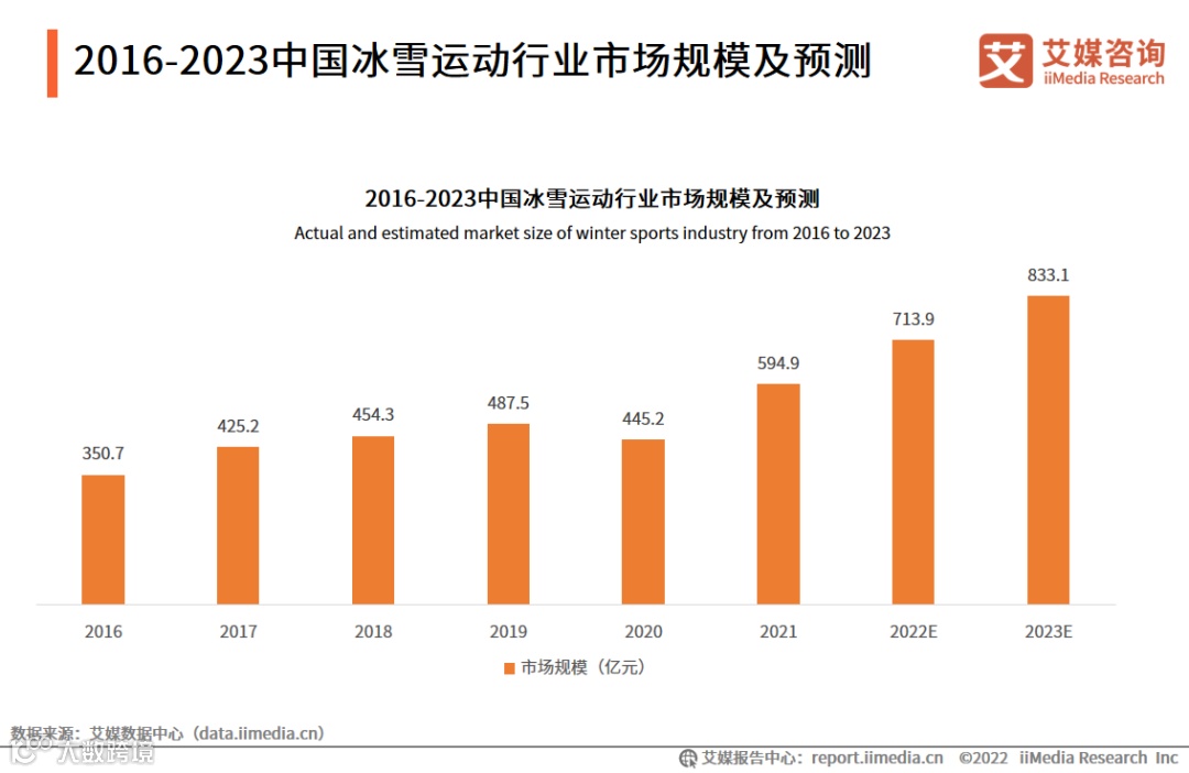 iiMedia Research(艾媒咨询)数据显示,2022年中国冰雪运动产业市场规模将突破700亿元,且得益于国家政策多重利好,冰雪运动行业的市场规模将不断扩大。