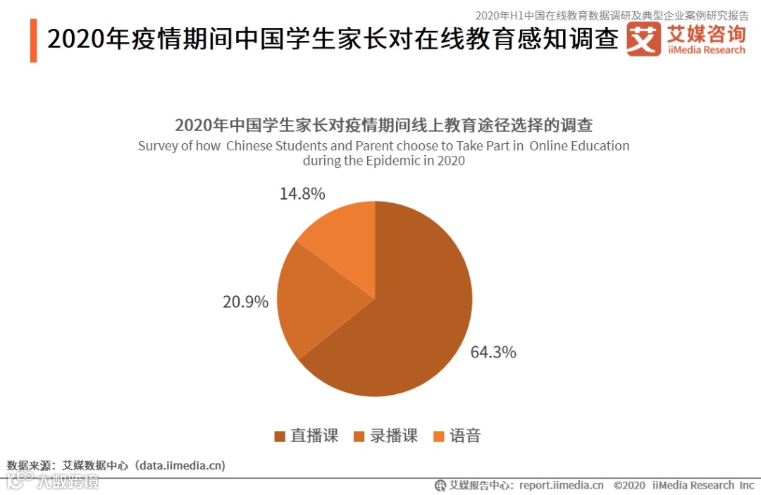 iiMedia Research(艾媒咨询)数据显示,疫情期间超六成学生家长选择直播课的形式上课,占比达到64.3%,其次是录播课和语音的形式。艾媒咨询分析师认为,相比录播和语音,直播课的教学互动性更强,符合家长学生需求。