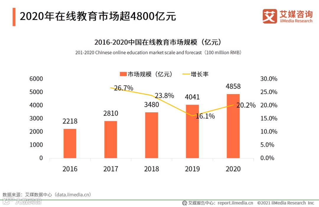 iiMedia Research(艾媒咨询)数据显示,中国在线教育行业增速在2019年逐步递减,反映在线教育行业的用户红利逐渐消退。2020年,“黑天鹅”事件发酵促使在线教育迎来新的转机,在“停课不停学”的政策扶持下,在线教育市场规模增速回暖,市场规模达4858亿元,增速上升至20.2%。