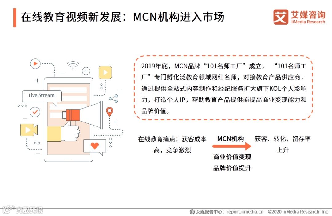 而随着在线教育内容在短视频平台的流行,该领域在平台的运营逐渐走向标准化,专业MCN机构开始进入市场,通过打造教育KOL等方式促进在线教育平台在短视频平台提高商业变现能力和品牌价值。随着专业机构的入局,在线教育行业营销获客渠道进一步升级,有助于在线教育解决获客、转化和留存问题。