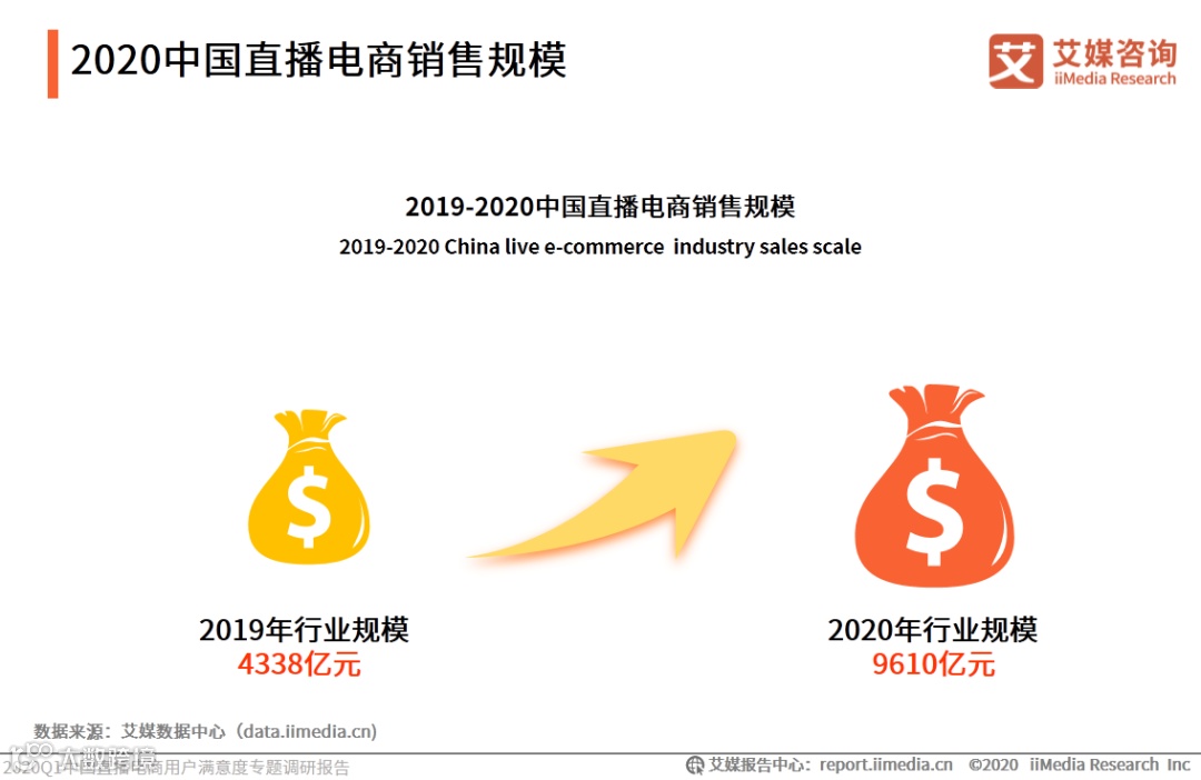 iiMedia Research(艾媒咨询)数据显示,2019年中国直播电商行业总规模为4338亿元,预计2020年国内直播电商行业规模将达到9610亿元,约占中国网络零售规模的8.7%。艾媒咨询分析师认为,直播电商通过营造抢购气氛,增强社交性和互动性来吸引消费者,未来直播电商渗透率将进一步提升。
