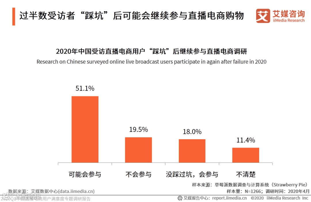 iiMedia Research(艾媒咨询)数据显示,51.1%的受访者遇到不满意的服务后可能会参与直播电商购物,19.5%的受访者表示不会再参与。艾媒咨询分析师认为,直播电商平台应加强监管,协调直播平台与产品经营者关系,加深消费者信任。(备注:“踩坑”意为遇到较差服务)